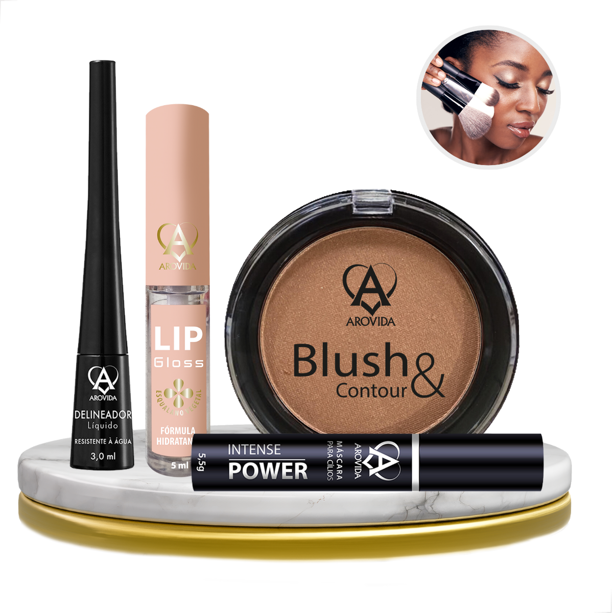 O Kit de Maquiagem Arovida Cosméticos reúne os 4 itens essenciais para realçar sua beleza todos os dias: pele corada, olhos destacados e lábios brilhantes. Fórmulas confortáveis, alta performance e resultado profissional com aquele toque de leveza que você ama!